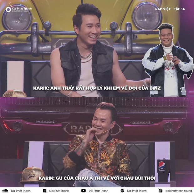 Mới đây, Karik lại tiếp tục chọc ghẹo Binz khi đăng tải tấm ảnh chế về màn trình diễn của Yuno Bigboi tại tập 13 Rap Việt vừa qua. Nội dung bức ảnh chế nhắc trực tiếp đến Châu Bùi - "nàng thơ" của Binz - khiến "khổ chủ" chỉ biết câm nín mà thôi.