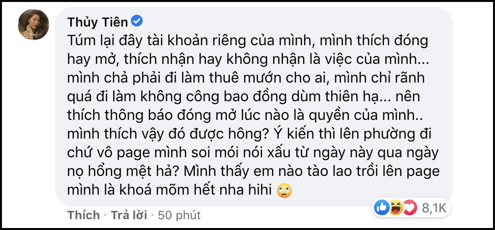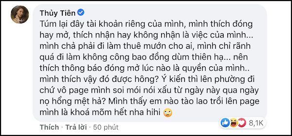 Có vẻ vì quá nhiều ý kiến trái chiều nảy sinh, mới đây, Thủy Tiên đã lên tiếng đáp trả antifan một cách gay gắt. Cô cho biết: 'Túm lại đây tài khoản riêng của mình, mình thích đóng hay mở, thích nhận hay không nhận là việc của mình, mình chả phải đi làm thuê mướn cho ai, mình chỉ rảnh quá đi làm không công bao đồng dùm thiên hạ... nên thích thông báo đóng mở lúc nào là quyền của mình.. mình thích vậy đó được hông? Ý kiến thì lên phường đi chứ vô page mình soi mói nói xấu từ ngày này qua ngày nọ hổng mệt hả? Mình thấy em nào tào lao trồi lên page mình là khoá mõm hết nha hihi'.