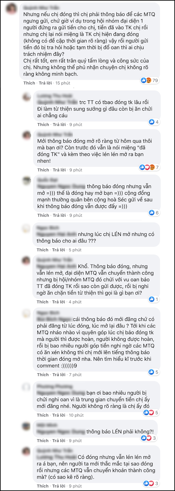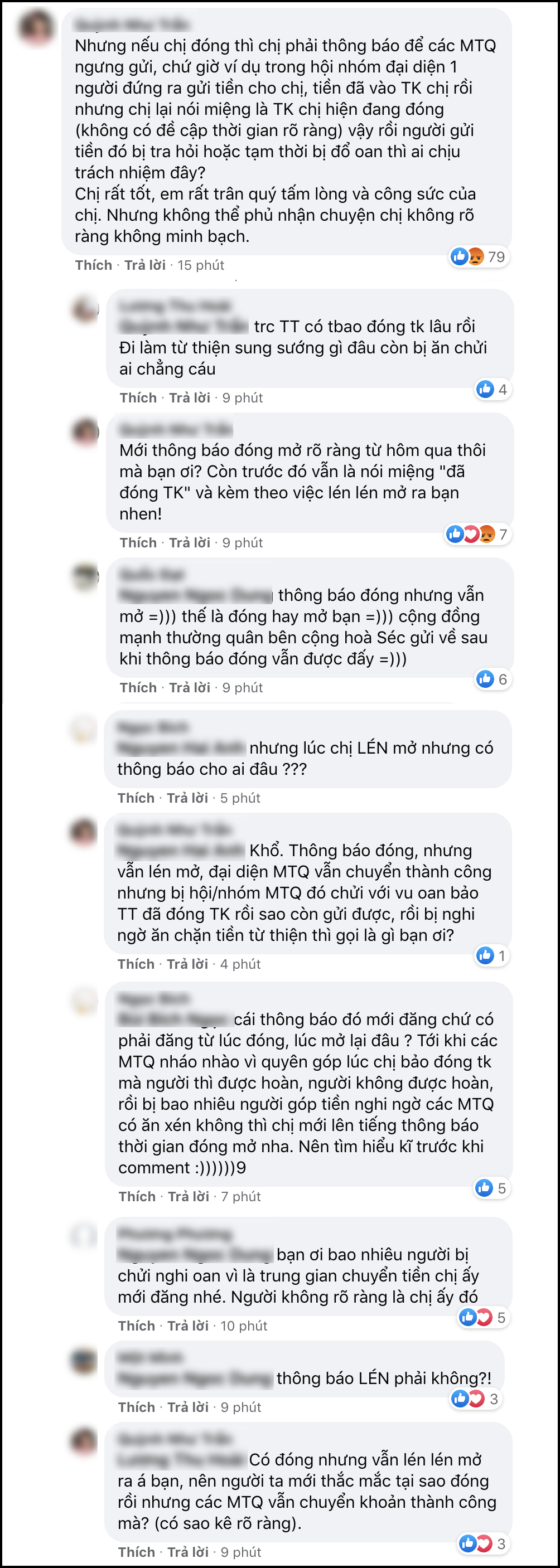 Cư dân mạng cho biết, tài khoản là của Tiên nhưng khi đứng ra nhận tiền, cô cần có trách nhiệm với từng đồng tiền mà mạnh thường quân gửi gắm, đóng - mở cũng nên thông báo để không làm ảnh hưởng đến nhiều người.